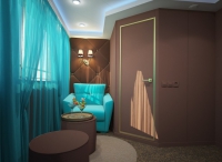 В каюте: двуспальная кровать (размер 1600х2000 мм), столик, пуф, шкаф, телевизор, фен, телефон внутренней связи, радио, холодильник, сейф, панорамное открывающееся окно.